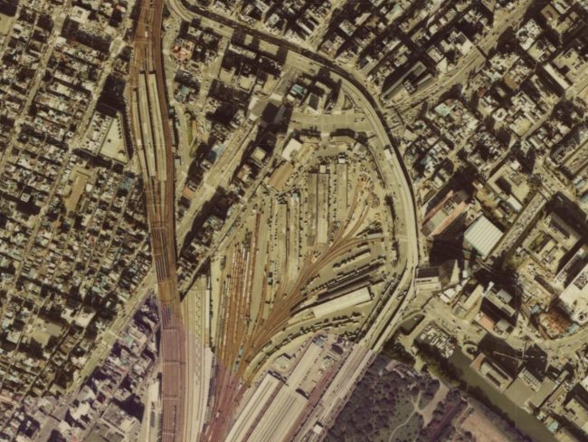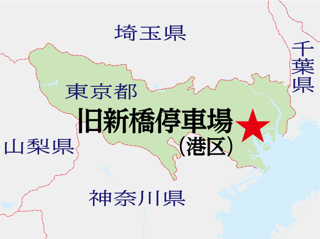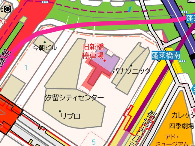 東京都港区の汐留は高層ビル群が立ち並ぶオフィス街ですが、ここには日本の鉄道に関わる重要な筆(土地)があります。地図を見ると、高層ビル群の狭間にT字の筆(土地)があることが分かります。実はこのT字の筆(土地)の場所には新橋停車場がありました。現在この場所には、発掘調査で発見された遺構をもとに復元された旧新橋停車場の施設があります。T字のプラットフォームも復元され、プラットフォームの形がそのまま筆(土地)として設定されたかのようです。