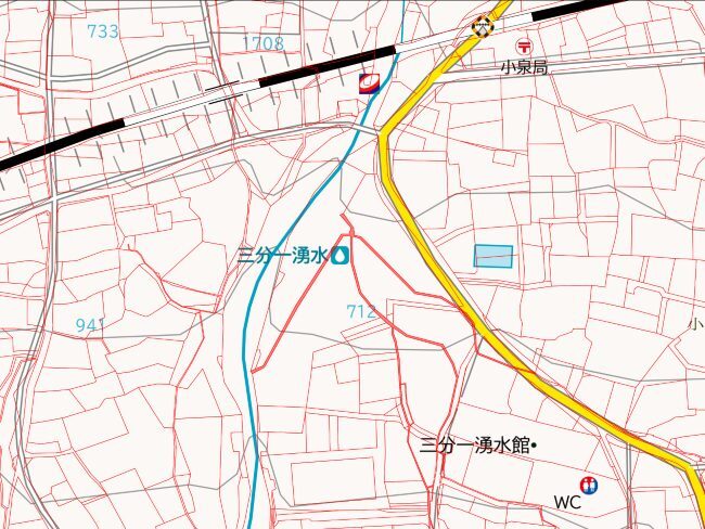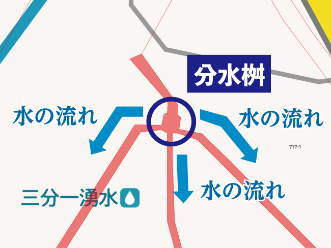 三分一湧水は上流から流れてきた水を分水枡に貯め、分水杭を通して三方に均等に水を流す水の分配装置で、地図でポリゴンを見ると、分水枡のポリゴンと三つの方向に流れていく水路のポリゴンの姿を見ることができます。