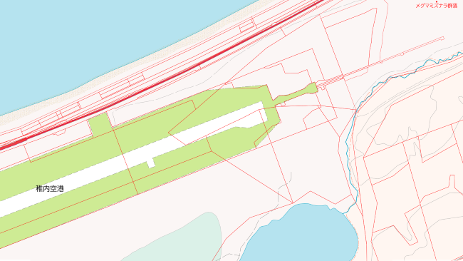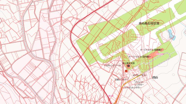 このような進入灯の筆(土地)が設定されている空港は多く、その中でも形状が良く表されているのが稚内空港と南ぬ島石垣空港(新石垣空港)です。稚内空港は日本最北にある空港で、宗谷地域の玄関口になっています。進入灯の筆(土地)を見ると、滑走路から一直線に延びる筆(土地)が綺麗に表されています。一方、沖縄県の石垣島にある石垣空港は八重山地域の玄関口となる空港で、2013年に市街地にあった空港が移転して開港しています。進入灯の筆(土地)を見ると、移転前からある農地等の土地の中を貫くような形で設定されています。筆の形状が、農地等の区画の筆と角度が異なっているために、鮮明に地図上に表されています。