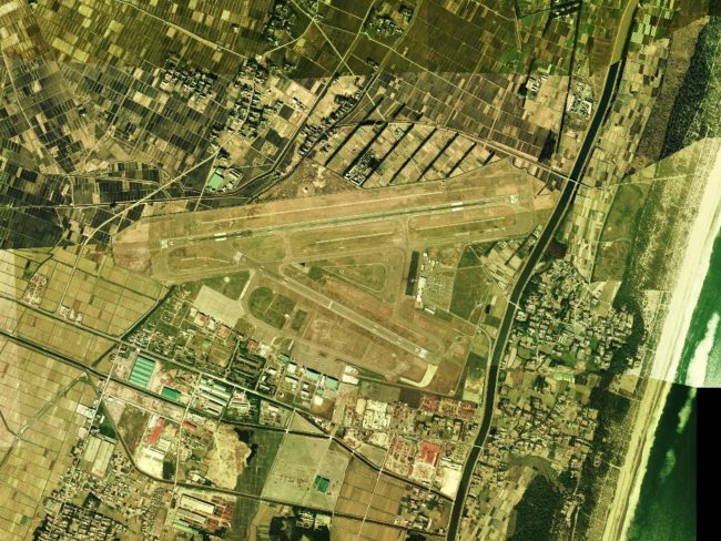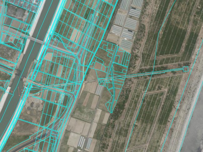 これは進入灯で、空港へ着陸をする航空機に対して進入方向や位置、高さ、姿勢など様々な情報をパイロットに伝える役割を持っています。筆(土地)と新しい空中写真を重ねて見ると、筆(土地)と進入灯がぴったり一致しています。つまり、仙台湾に向かって一直線に延びる筆(土地)は飛行場の進入灯の筆(土地)になります。