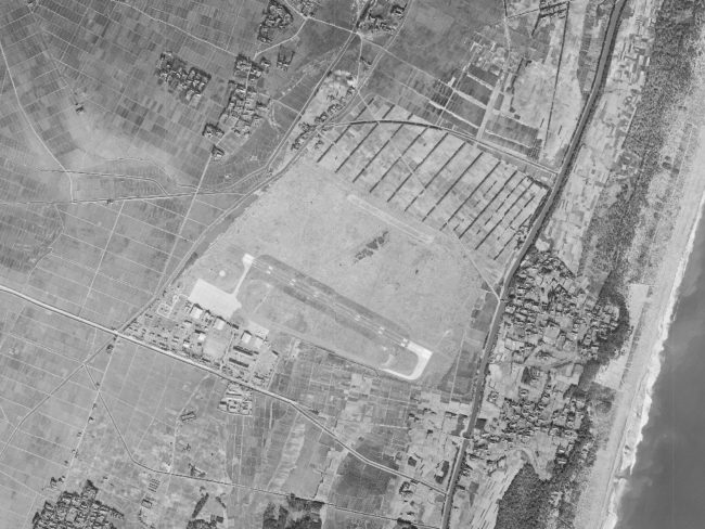 一直線に延びる筆(土地)を知るために、年代ごとの空中写真で比較すると、1961年~1969年の空中写真にはA滑走路のみが写っており、一直線に延びる筆(土地)は水田と防風林、砂浜になっています。一方、1974年~1978年で見ると1972年に造られたB滑走路が写っています。そして、B滑走路の先には仙台湾に向かって等間隔に並んだ建造物が見えます。