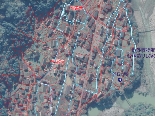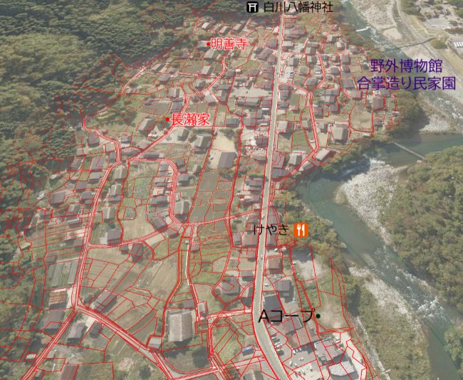 白川郷の集落には水路が張り巡らされ、切妻合掌造りと呼ばれる三角形の茅葺屋根の建物が立ち並んでいます。空中写真を重ねて見ると、合掌造りは妻面が南北を向いて建つ、南北に長い建物となっています。同様に筆(土地)も南北に長い形状となっており、白川郷の筆(土地)の特徴となっています。