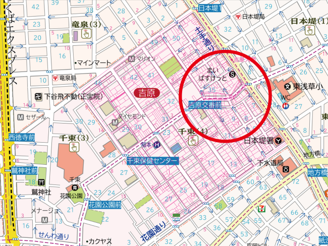 改めて吉原の痕跡を探して地図を見ると、土手通りから碁盤の目状に整備された吉原に通じる道の中に、緩やかに曲がるポリゴンを見つけることができます。このポリゴンは「五十間道」と呼ばれる道のもので、吉原遊郭の痕跡の一つになっています。五十間道は吉原遊郭へ繋がる唯一の道であり、土手通りからはカーブを描く構造になっているため、外部から吉原の街を直接見ることができない形になっています。