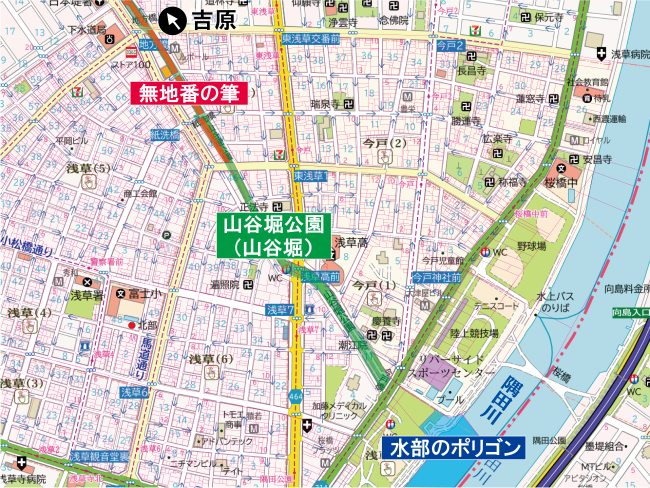 実は、この山谷堀は昭和時代まで水を湛えた水路として残っていました。1976年(昭和51年)頃から堀は暗渠化され、山谷堀公園として整備されました。それでも、水路の跡は筆(土地)に残されています。筆(土地)を見ると、隅田川から山谷堀公園に向かって「水」のポリゴンが延びており、ここが山谷堀の最下流地点であったことがわかります。周辺には錦絵の題材として描かれた大根まつりで知られる待乳山聖天があります。