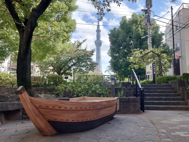 山谷堀は現在、山谷堀公園へと姿を変えましたが、公園には猪牙船のモニュメントが設置されています。公園を水路に見立て、筆(土地)と合わせて眺めると、猪牙船に揺られて吉原へ向かう人々の姿を偲ぶことができます。