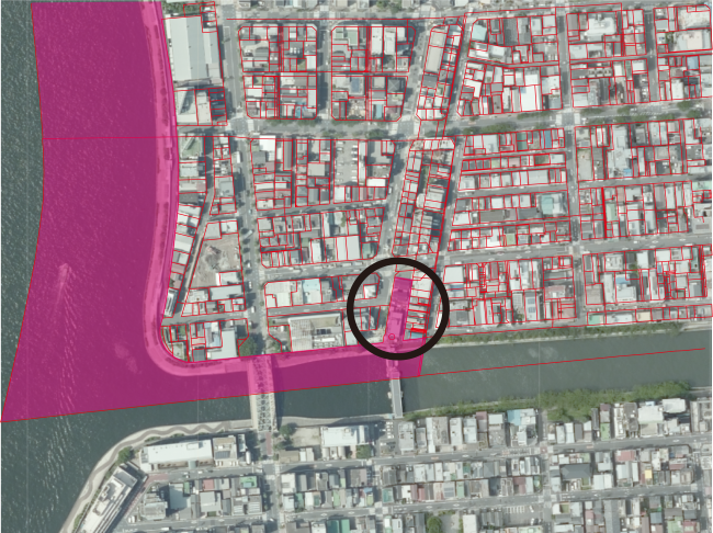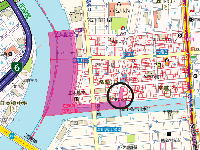 地図で芭蕉庵史跡展望庭園付近を見ると、不思議なポリゴンを見つけることができます。それは、庭園の前を流れる小名木川と隅田川の「水」のポリゴンです。このポリゴンを見ると、萬年橋の先に突起した部分(〇で囲んだ部分)まで「水」のポリゴンとなっています。