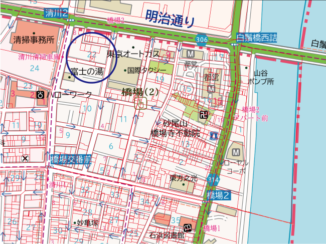 地図で平賀源内の墓所を見ると、二つの筆(土地)が設定されています。薄いピンクで塗った筆(土地)と濃いピンクで塗った筆(土地)です。二つの筆(土地)を空中写真で見ると、薄いピンクで塗った筆(土地)は墓所の敷地であることが分かります。また、濃いピンクの筆(土地)には、屋根らしきものが見えます。