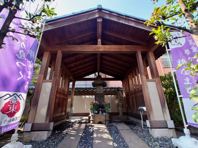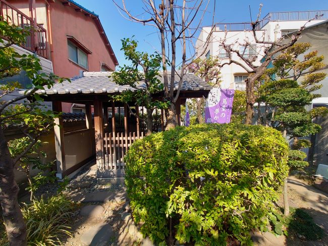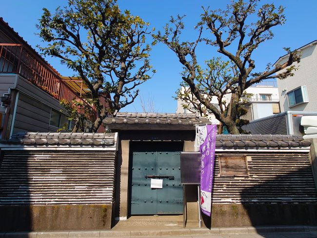 現地を訪ねると、築地塀と重厚な門扉があり、扉を開けると、庭園のような空間が広がっています。そして、濃いピンクの筆(土地)には、壁のない建物があり、墓石が納められていることが分かりました。