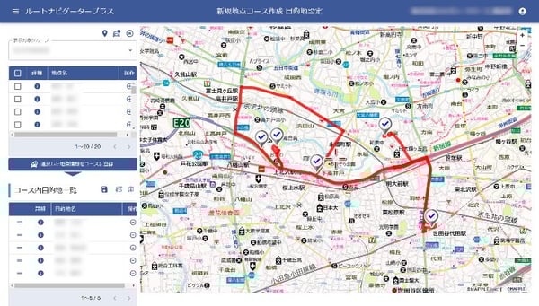 立ち寄り地点は決まっているが、ルートは特に指定しないという場合に便利なのが、巡回する地点だけを登録しておき、車載アプリ側で経路探索を行う方法です。指定した順序で立ち寄り地点を巡回するコースだけでなく、経路探索機能で計算した効率的な回り方のコースを作成することもできるため、業務に合わせて選択できます。