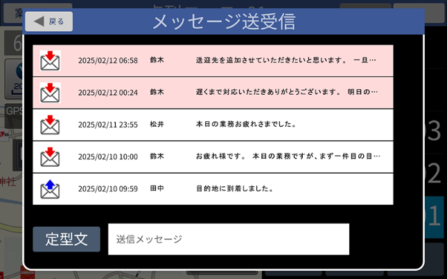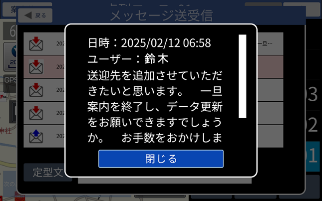 ルートナビゲータープラスの管理Webシステムでは、特定の車載器に向けてメッセージを送信できます。これにより、リアルタイムに指示を伝達し、状況に応じた対応をサポートすることが可能です。