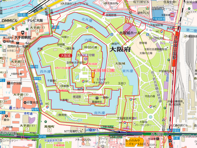 筆(土地)は、その形状から過去の施設の姿を推測することができます。大阪市にある大阪城もその一つです。大阪城(大坂城)は、戦国時代に豊臣秀吉によって築城され、大坂夏の陣で焼失しましたが、徳川秀忠によって再建されました。その後、城は幾度かの自然災害により大きな被害を受けました。1931年(昭和6年)になると、大阪城の天守閣は復興天守として再建され、現在では天守閣を中心に広大な公園として整備されています。