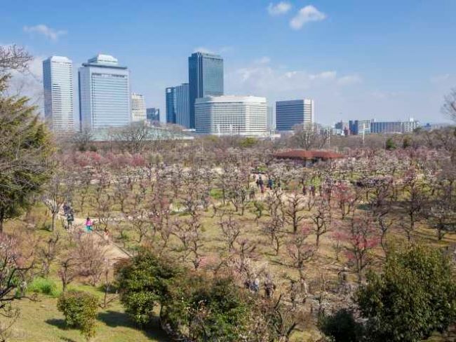 大阪城公園は、内濠と外濠に囲まれています。天守閣を中心に、大手門や青屋門、桜門、多聞櫓や千貫櫓、乾櫓などの建物と合わせて、巨大な城郭を形成しています。ランドマークとなる天守閣は、地上55m、5層8階の建物で、歴史博物館が併設されています。また、公園内には、コンサートに利用される大阪城音楽堂や大阪城ホールもあります。そのほかにも、野球場や弓道場、修道館といったスポーツ施設などが点在しています。