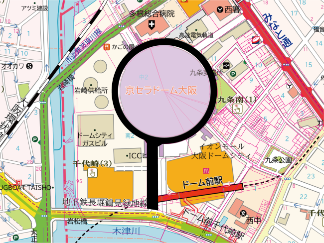 京セラドーム大阪の筆(土地)を俯瞰すると、複数の筆(土地)からなる円形と、ドームを周回する筆(土地)が見られます。周回する筆(土地)は道路にあたります。ここで、筆(土地)の形状から、興味深い発見がありました。それは、京セラドームからドーム前駅に向かって一直線に伸びる筆(土地)の存在です。この筆(土地)とドーム周辺の筆(土地)を合わせて見ると、まるで「虫眼鏡」のような形に見えるのです。虫眼鏡のレンズ部分はドーム球場の建物の筆(土地)、フレームはドームを周回する道路の筆(土地)、そして柄の部分はドーム前駅へと続く道路の筆(土地)といった具合です。やや想像を働かせた見立てではありますが、筆(土地)に着目することで、通常の地図や航空写真では気づきにくいユニークな発見が得られることもあるのです。