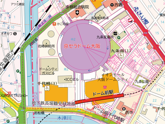 プロ野球チーム「オリックス・バファローズ」の本拠地である京セラドーム大阪は、独特のフォルムをしています。その姿は、まるでUFOを連想させるような、特徴的なデザインです。実は、特徴的なのは建物だけではありません。京セラドーム大阪とその周辺の筆(土地)を俯瞰して見ると、ある形をした面白い筆(土地)になっています。