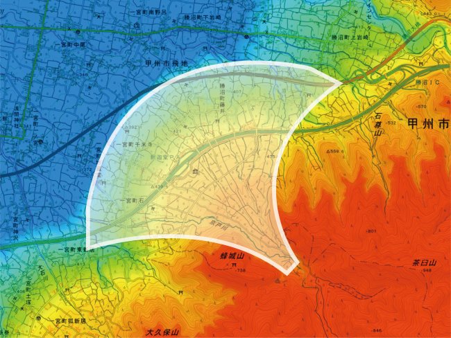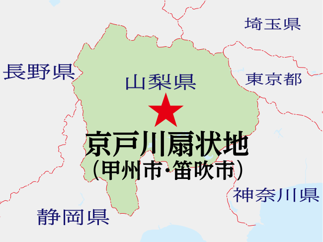 甲州市と笛吹市には、京戸川扇状地と呼ばれる自然地形が広がっています。この地形は、河川が狭い山間地から平坦地に出た時に流れが弱まり、運ばれてきた土砂が下流で扇形に広がって堆積することで形成される、いわゆる扇状地です。