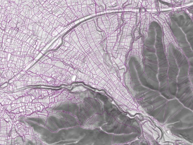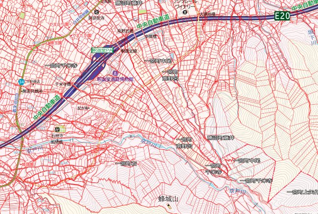 傾斜量図は、黒い部分が急峻な地形、白い部分は緩やかな地形を示します。京戸川扇状地周辺の山間部と扇状地では、傾斜に明確な違いがあることがわかります。筆(土地)データと重ね合わせると、扇状地では筆(土地)が細かく設定されていることがわかります。