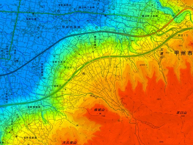 筆(土地)をいくつかの資料と組み合わせて見ることで、扇状地の特徴をより明確に捉えることができます。京戸川扇状地の筆(土地)を段彩図に重ねて見ると、扇の要にあたる位置は標高が高く、赤色で表示されます。そこから扇状地が広がるにつれて標高が低くなり、青色へとグラデーションが変化していく様子が示されています。