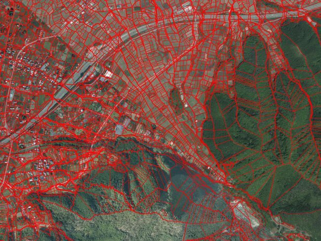 次に、空中写真と地形図を用いて、土地利用について見ることにします。空中写真では、扇状地に家屋や畑が点在している様子が確認できます。これらの土地には、それぞれ筆(土地)が設定されています。