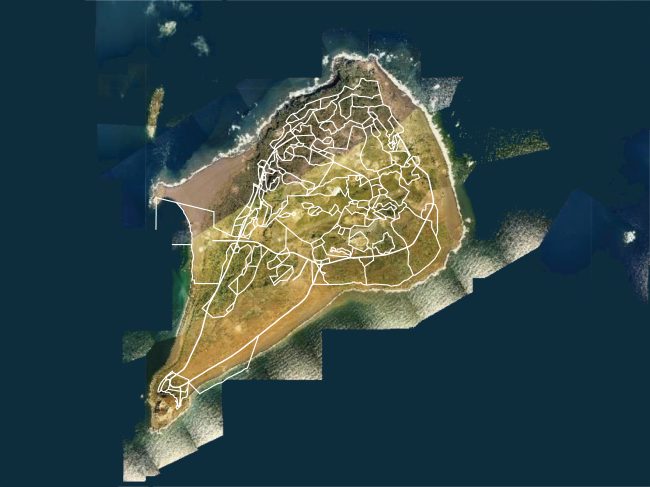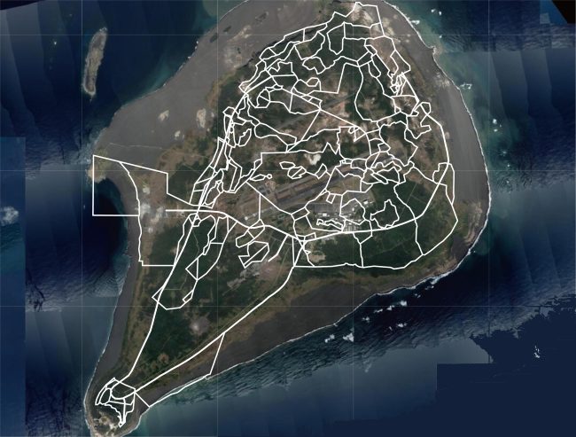 このように硫黄島の筆(土地)は、硫黄島に人々が住んでいた島の歴史を物語っています。実は、硫黄島の筆(土地)には、島の特徴を表すもう一つのメッセージが秘められています。1974年から1978年の空中写真を見ると、筆(土地)は島の大きさとほぼ同じ形で設定されています。しかし、2023年の空中写真では、島の面積は筆(土地)よりも一回り大きくなっていることが分かります。