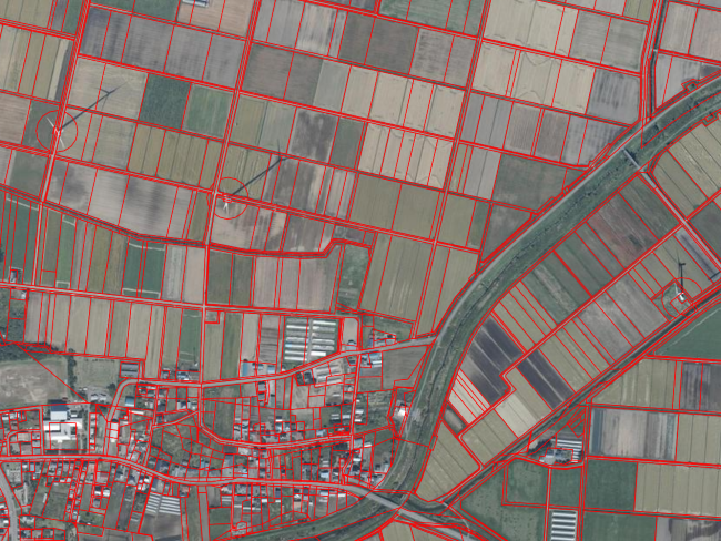 北海道江差町に古銭の形をした筆(土地)が点在しています。農地の中にある、この不思議な筆(土地)は一体何なのでしょうか。空中写真でみると、筆(土地)の場所には、白い風車のような施設が建っています。この特徴的な筆(土地)にある施設は風力発電の施設です。