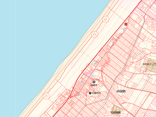 全国には電力会社や再生可能エネルギー事業者が管理・運営している風力発電施設があり、風力発電のための特徴的な筆(土地)は各地で見ることができます。新潟県胎内市にある村松浜・中村浜・笹口浜の3つの浜には、等間隔に並んだ古銭のような形の筆(土地)が印象的です。この地域は、日本海から安定した風が吹き、騒音の心配も比較的少ないことから、風力発電に適した環境といえるでしょう。海岸線に立ち並ぶ風車の姿は壮観です。