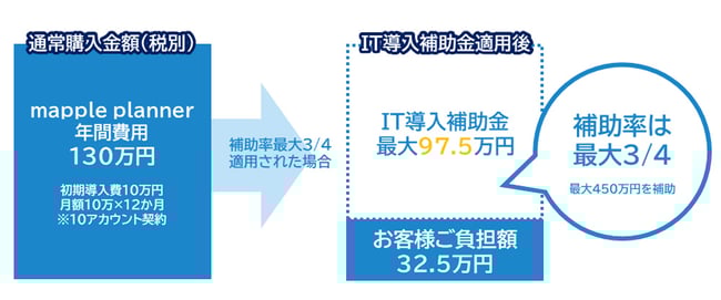 これにより、補助対象者となる中小企業・小規模事業者が「mapple planner」を新たに導入する場合、初期費用と月額費用1年分の合計額の最大4分の3を補助金として受け取ることができます。