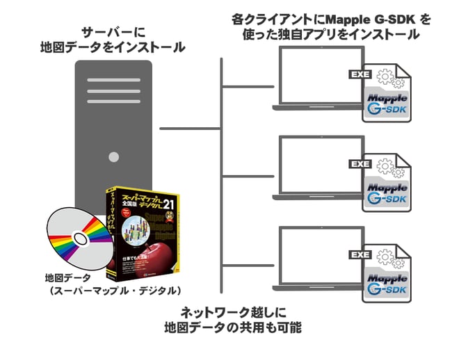 ①サーバー上の地図データ参照対応 新型コロナウイルス感染症の流行に伴い加速したリモートワーク・在宅勤務環境でも効率的にMappleG-SDKをご利用いただけるようにするため、これまで個々のクライアントPCにインストールすることを必須としていた地図データをNASやファイルサーバーなどイントラネット上に置き、参照して利用できるように拡張しました。