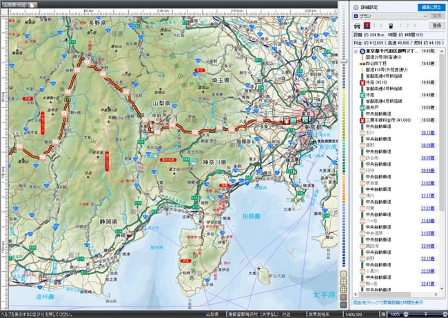 カーナビゲーションでも使われている精度の高いルートデータを使った充実のルートシミュレーションができます。