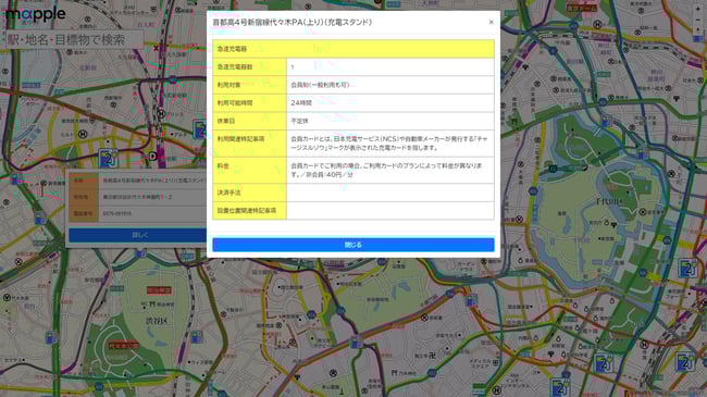 MAPPLE LABS(マップルラボ)「EV充電ステーションマップ」では、当社製品「マップルナビ」に搭載しているEV充電ステーションの情報を公開。地図上の充電ステーションのアイコンをクリックすると、充電ステーションの情報が表示されます。