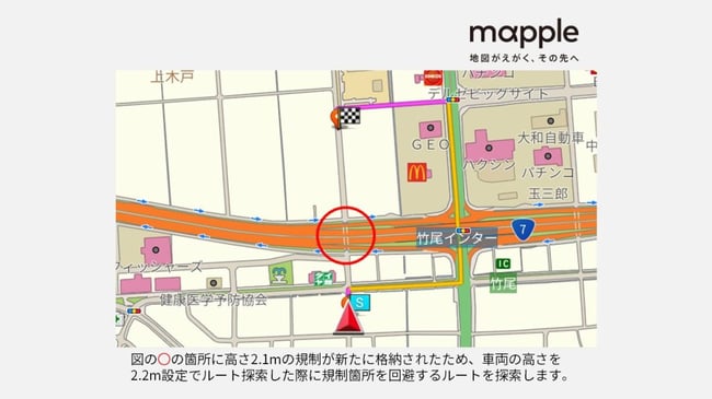 「業務用カーナビSDK Ver.7.0」では2022年最新地図データを搭載しており、交通規制情報の収録範囲も拡大しました。この対応によりVer.6.0で実装した高さ制限・車幅制限などを考慮したルート探索をより広範囲でご利用いただけます。
