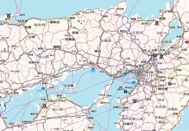 <各都市の繋ぐ交通網を分かりやすく、道路と鉄道、航路形状を簡略化>