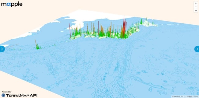「TerraMap APIを使ってみた」では、マップマーケティングの「TerraMap API」とマップルの「ベクトルタイル地図」を使い、都道府県や市区町村別の性別・年齢別人口や昼間人口、飲食や小売事業所数など、表示させたい統計情報を選択するだけで棒グラフや立体マップとして地図上に重ねて表示することが出来ますので、これまでにエリアマーケティングの経験が無い方にも、地域ごとの特性や分布など商圏分析の手法を直感的に体験いただけるようになっています。