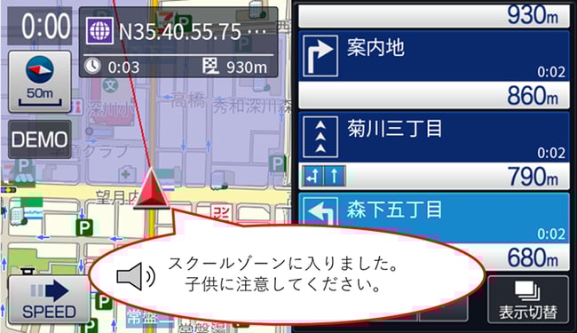 これまでもスクールゾーンや冠水危険区域、催事エリアなど、お客様の持つ図形情報を地図上に表示し目視することは可能でしたが、車両が進入した際に音声やメッセージで注意を促したり状況を表示したりする“イベントの発生”を実装するには、業務アプリ側で計算して包含するか確認する必要がありました。今回リリースする『業務用カーナビSDK Ver.8.0』ではAPIでポリゴン内外判定を行うことで、“イベントの発生”を容易に実装できます。