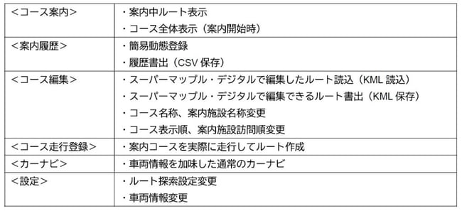 「ルートナビゲーター」は、ルート配送や収集、点検、送迎といった固定ルートを巡回する業務に特化したカーナビアプリケーションです。最大の特長である走行軌跡からのコース作成・編集機能に加え、地図ソフト「スーパーマップル・デジタル」と連携したKML取込機能、通常のナビと同様の音声・イラストによるコース案内機能、簡易動態記録機能、各種設定変更機能など、ルートの巡回・配送業務に最適な豊富な機能を有しております。
