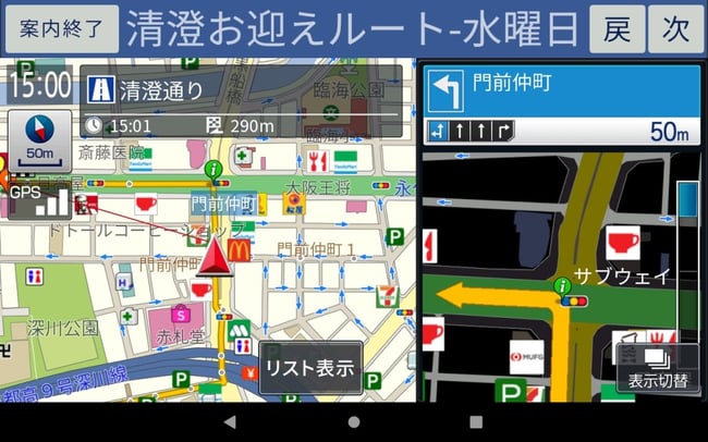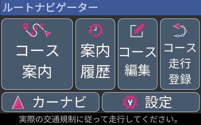 作成したコースを元に、通常のナビと同様に開始前のコース全体確認、案内時の右左折音声、イラスト案内などを行います。