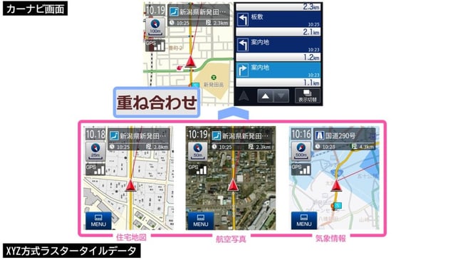従来は、カーナビ用の地図と住宅地図や気象情報、航空写真などカーナビにはない情報は別の画面やアプリケーションで表示する必要がありましたが、本オプションを利用することにより、カーナビで表示する地図の上にXYZ方式のラスタータイルデータを簡単に重ね合わせて表示することができるようになります。