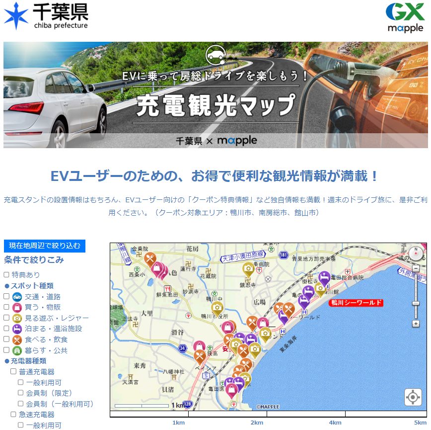 千葉県内の主に南房総エリアにおけるEVによるドライブ観光を推進するため、マップルが保有する「観光スポット情報」や「充電スタンド情報」を掲載した観光情報サイトです。