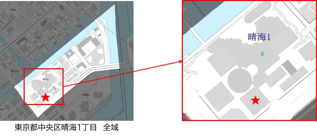 リバースジオコーディングは、指定された緯度経度や地図上で指定された位置から該当する住所情報を取得する技術です。例えば、下記地図にある★の位置でリバースジオコーディングを実行した場合、従来の機能では「東京都中央区晴海1丁目」までの住所情報しか取得できませんでしたが、今回の機能追加により「東京都中央区晴海1丁目8-10」といった番地・号までの詳細な住所情報が取得可能です。