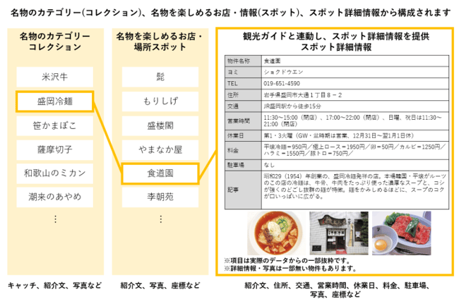 お客様のサービス(WEB・アプリ等)において『名物』を切り口とした地域紹介を行う際の情報として掲載いただけます。