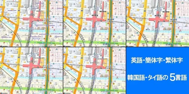 「MAPPLE デジタル地図データMDX」と組み合わせることにより日本語以外の言語を表示させた地図がご利用いただけます。 |