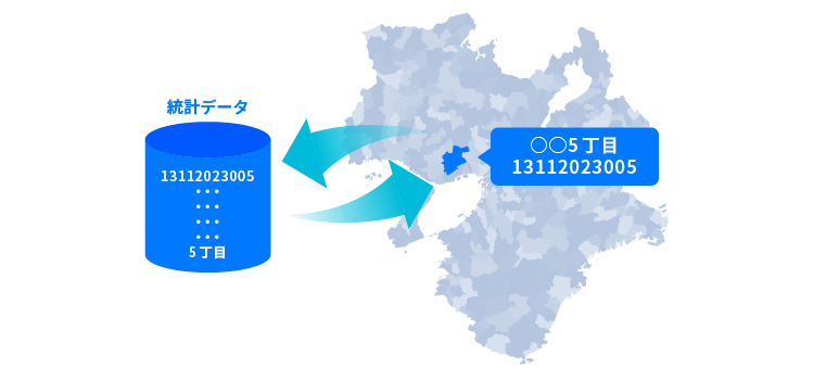 ポリゴンデータは、IDをキーにそのエリアの名称や基本情報、人口、世帯数、事業所数などの統計情報等、様々な情報を属性として持つことができます。