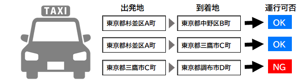 「一般旅客自動車運送事業者は、発地及び着地のいずれもがその営業区域外に存する旅客の運送(路線を定めて行うものを除く)をしてはならない。」(道路運送法(第20条:禁止行為))