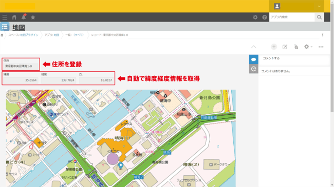 レコード入力画面で住所を登録すると、自動的に緯度・経度情報が取得され、入力した住所周辺の地図が表示されます。