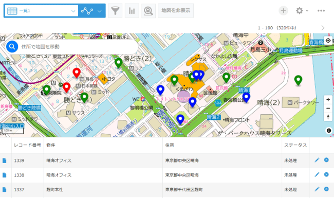 地図上に各レコードの位置情報をもとにマーカーが表示されます。レコードの条件によってマーカーを色分けすることが可能です。各物件の位置関係や物件の密集度、レコードの登録内容などを一目で分かりやすく把握するのに役立ちます。