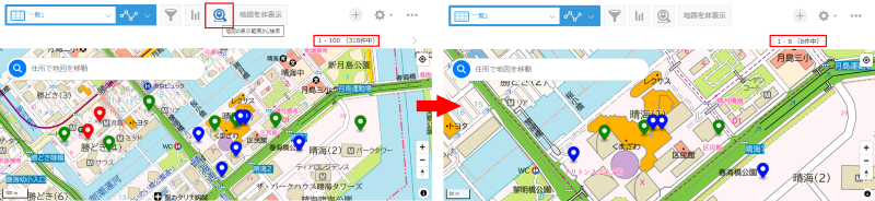 表示している地図の範囲にあるレコードを検索します。現在地や目的地から近い場所にあるレコードを絞り込み、ビジネス活動をサポートします。