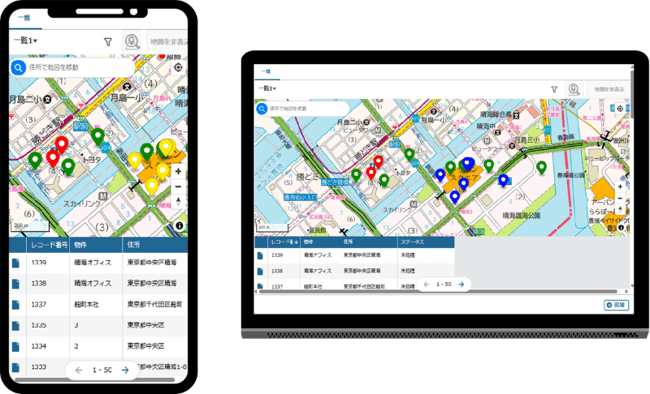 不動産物件の管理業務では、「空室」「入居済み」「商談中」など、物件のステータスごとにピンの色分けが可能です。これにより、地図上で空き状況を即座に把握でき、お客様へのご提案や内見日程の調整をよりスムーズに行うことができます。