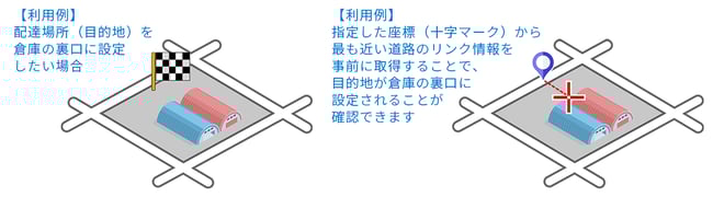 指定した座標から、最も近くの道路リンク上の座標や道路種別、リンクまでの距離などの情報を取得することができます。 この機能により、出発地や目的地の座標が意図した場所(道路)に紐づくか事前に確認することができるようになりました。