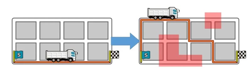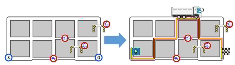 設定条件を入力することで、通行不能な規制が存在する道路を迂回し、適切なルートを生成します。(車両条件を考慮したルート探索例)