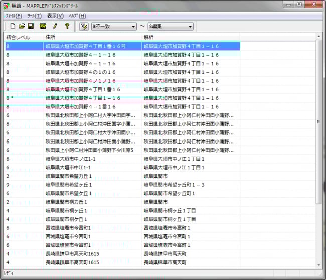 レベルが0~4で絞り込みを行うことで住所文字列が正しくないデータを抽出することが可能です。