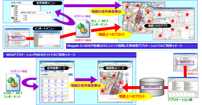 Windows上で動作するコンポーネント製品です。お客様が構築されるアプリケーションに、住所検索機能や座標付与機能を組み込むことができます。